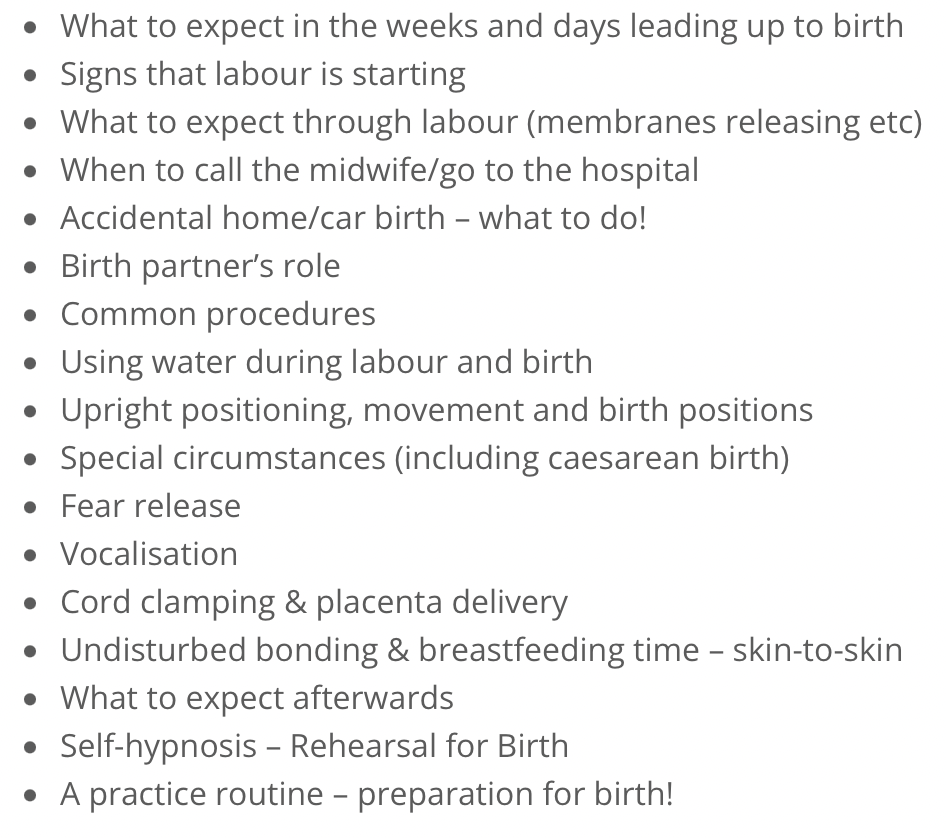 You will learn self hypnosis and how to enter a state of deep relaxation through visualisation and breathing. We will explore techniques such as massage, pressure points and movement to assist and optimise your body and your baby’s passage in childbirth. You will have opportunities to discuss preferences, make informed decisions, receive advice and information on how to best prepare your home, your body, your mind, your space.